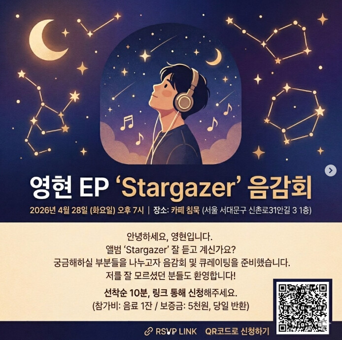 오는 4월 28일 화요일, 신촌 카페 침묵에서 제 EP 앨범 별 될 준비 (Stargazer) 음감회를 진행하게 되었습니다.